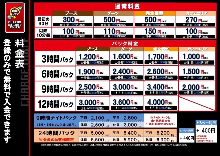 - オープン席 / カラープリンター / シャワールーム(別料金) / パウダースペース / ペアマットブース / マットブース / リクライニングチェア / 喫煙所 / 完全個室あり / 禁煙席 / 自動パック切替