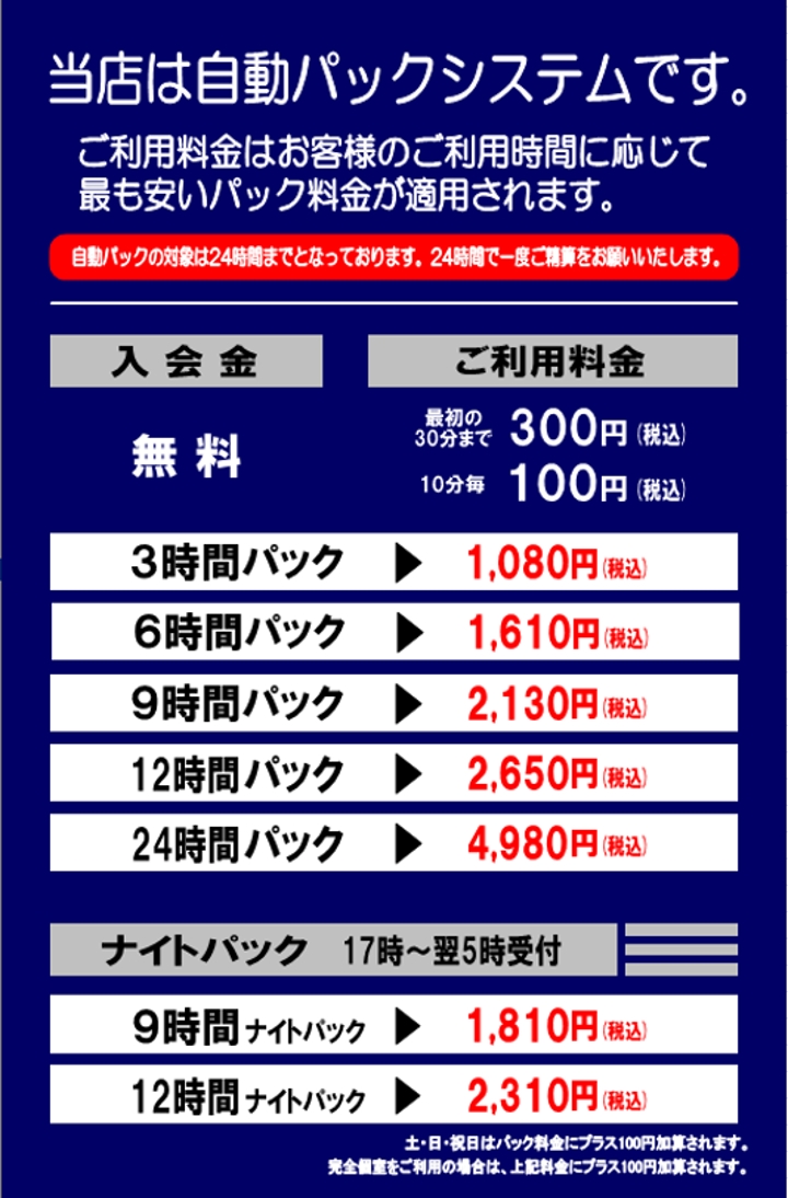 - CD-R(W) / DVD-R / DVD/Blu-Ray(ブルーレイ) 再生可 / ゆったりマッサージブース / オンラインゲーム席 / カラープリンター / コインゲーム機 / コンビニ商品 / シャワールーム / シャワールーム(別料金) / ソフトクリームマシン / パウダースペース / ビリヤード / ファミリールーム / マッサージチェア / マットブース / リクライニングチェア / 喫煙所 / 完全個室あり / 禁煙席 / 自動パック切替