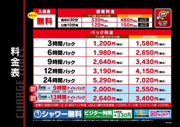 いつでも席料金(パック等)が20%OFF!